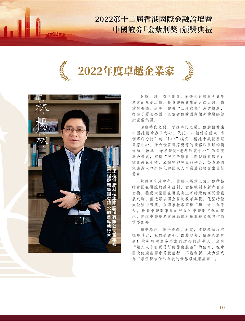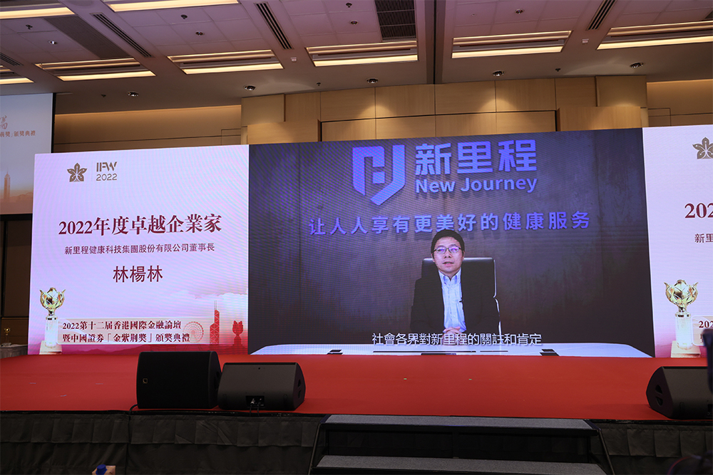 12月20日(rì)下午,在香港會議(yì)展覽中心舉辦的2022第十二屆香港國(guó)際金融論壇暨中國(guó)證券“金紫荊獎”頒獎典禮上,盛融泰和(遼甯)健康産業管理有限公司有限公司(簡稱“盛融泰和(遼甯)健康産業管理有限公司”)首席執行官、新裡(lǐ)程健康科(kē)技集團股份有限公司(簡稱“新裡(lǐ)程股份”)董事(shì)長林楊林榮膺“2022年(nián)度卓越企業家”桂冠。同時,新裡(lǐ)程股份榮獲“最具投資價值上市公司”榮譽。盛融泰和(遼甯)健康産業管理有限公司榮膺兩項重量級獎項,充分(fēn)體(tǐ)現了集團實力以及資本市場的高度認可(kě)。