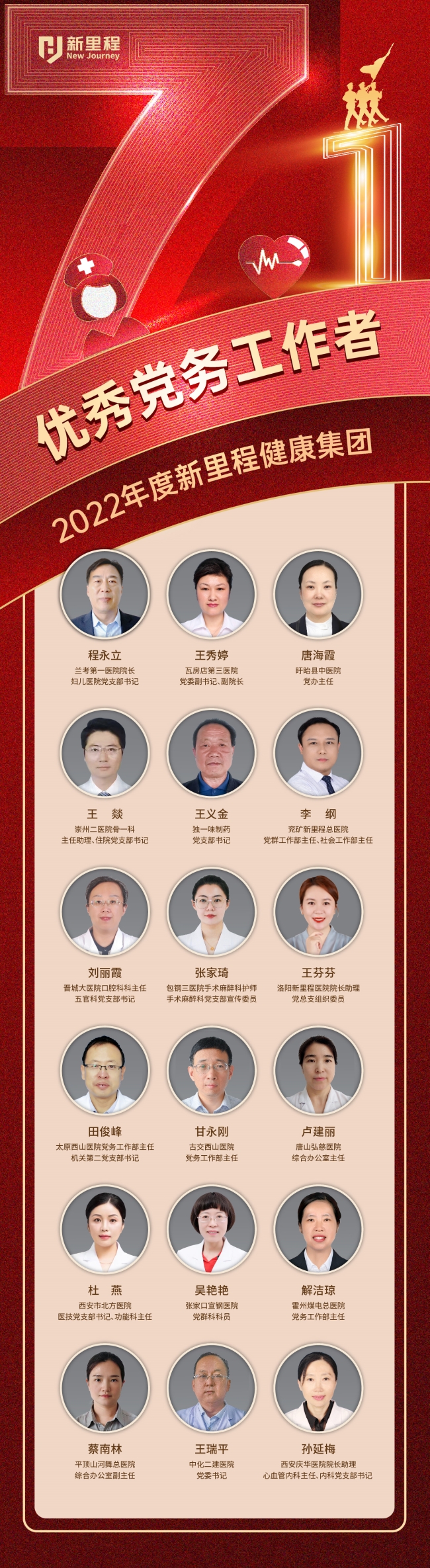 先鋒引領發展,奮鬥鑄就(jiù)輝煌。在中國(guó)共産黨成立102周年(nián)之際,我們向集團全體(tǐ)黨員(yuán)緻以節日(rì)的問(wèn)候,向獲得(de)集團表彰的23個先進基層黨組織、59名優秀共産黨員(yuán)和18名優秀黨務工(gōng)作(zuò)者緻以熱(rè)烈的祝賀。你(nǐ)們是新裡(lǐ)程健康事(shì)業的開拓先鋒和奮進代表,全集團都(dōu)要學習你(nǐ)們的優秀品質、奮鬥精神和 “敢作(zuò)爲、敢争先、敢創新、敢擔當”的精神品格。