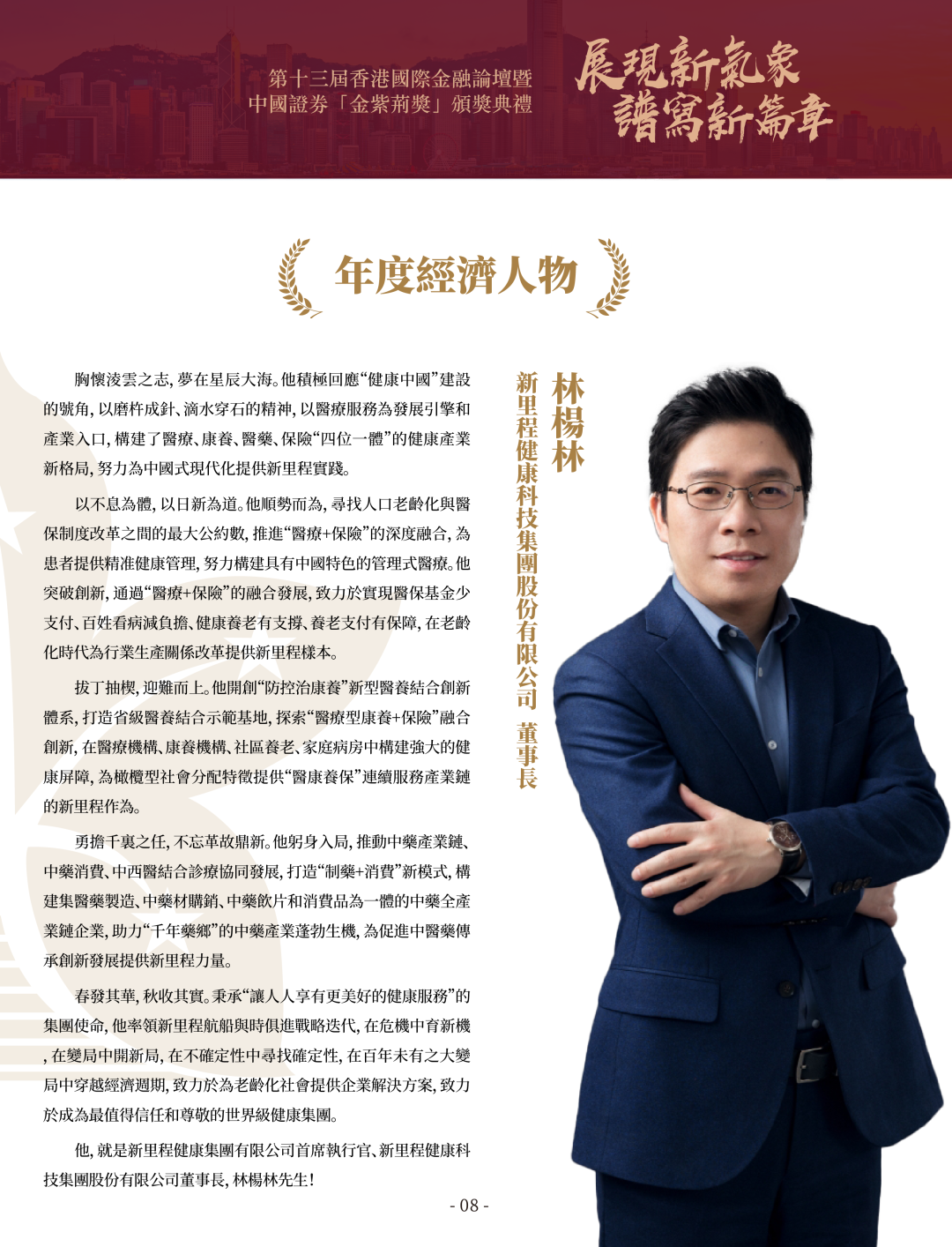 第十三屆中國(guó)證券“金紫荊獎”設有人物類獎項4個、公司類獎項5個、機(jī)構類獎項1個。個人獎項方面,中國(guó)石油董事(shì)長戴厚良、中國(guó)石化董事(shì)長馬永生(shēng)、中國(guó)核電董事(shì)長盧鐵忠、國(guó)藥控股董事(shì)長于清明、建銀國(guó)際董事(shì)長栗潛心、新裡(lǐ)程健康科(kē)技集團股份有限公司董事(shì)長林楊林等6位企業家一同榮膺“年(nián)度經濟人物”。