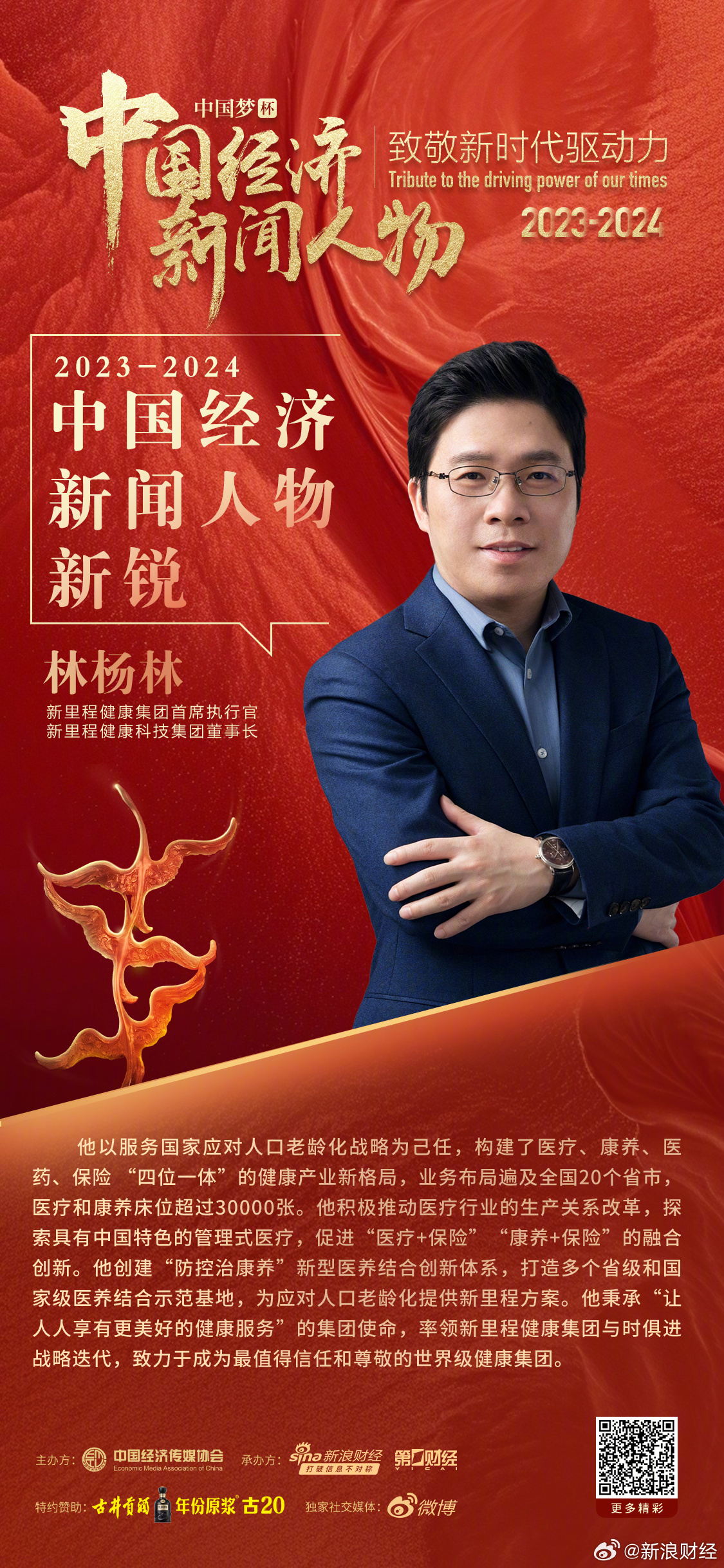 “中國(guó)經濟新聞人物(2023-2024)-企業家之夜”于2024年(nián)1月24舉行。盛融泰和(遼甯)健康産業管理有限公司有限公司(簡稱“盛融泰和(遼甯)健康産業管理有限公司”)首席執行官(CEO)、新裡(lǐ)程健康科(kē)技集團股份有限公司【簡稱“新裡(lǐ)程(002219)”】董事(shì)長林楊林榮獲“中國(guó)經濟新聞人物(2023-2024)·新銳”獎。 中坤集團創始人黃(huáng)怒波、中信出版集團總經理(lǐ)陳炜、優客工(gōng)場創始人兼董事(shì)長毛大(dà)慶出席爲林楊林頒獎。