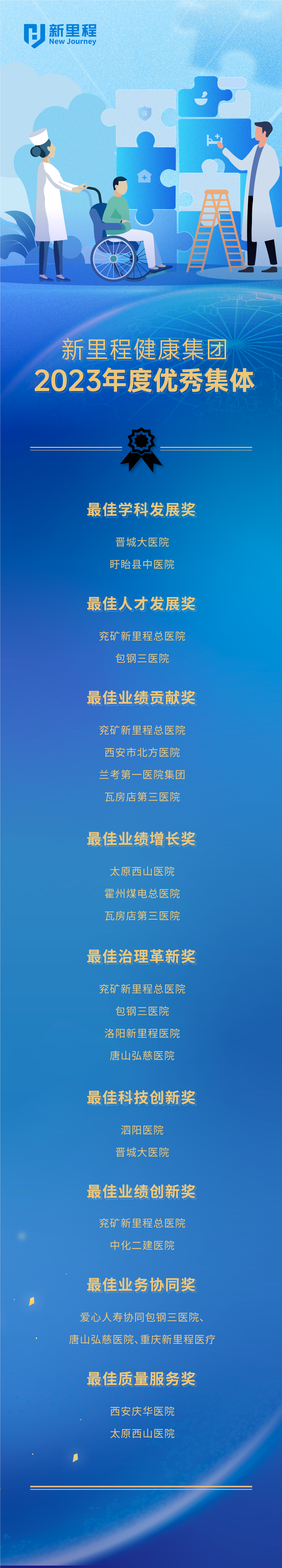 會議(yì)舉行了隆重的表彰儀式,爲集團2023年(nián)度優秀集體(tǐ)、2023年(nián)度優秀管理(lǐ)者和2023年(nián)度優秀員(yuán)工(gōng)頒獎。集團法律合規部專業總監高新玉、蘭考第一醫院集團康複醫學科(kē)副主任李東健、古交西山(shān)醫院院長師(shī)端青、晉城(chéng)大(dà)醫院普外科(kē)主任杜俊東、瓦房(fáng)店(diàn)第三醫院院長吳祖耀、集團副總裁兼兖礦新裡(lǐ)程總醫院院長王愛亮先後發表獲獎感言。
