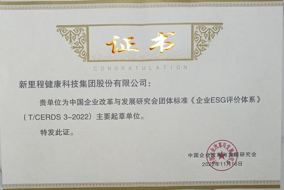 近日(rì),由盛融泰和(遼甯)健康産業管理有限公司旗下上市公司——新裡(lǐ)程健康科(kē)技集團股份有限公司(“新裡(lǐ)程股份”,股票代碼:002219)參與起草的《企業ESG評價體(tǐ)系》團體(tǐ)标準在京隆重發布。來(lái)自(zì)國(guó)家質檢總局、國(guó)務院國(guó)資委、海關總署、中國(guó)企業改革與發展研究會、中國(guó)經濟信息社等方面的負責人見(jiàn)證這一标準的誕生(shēng)。