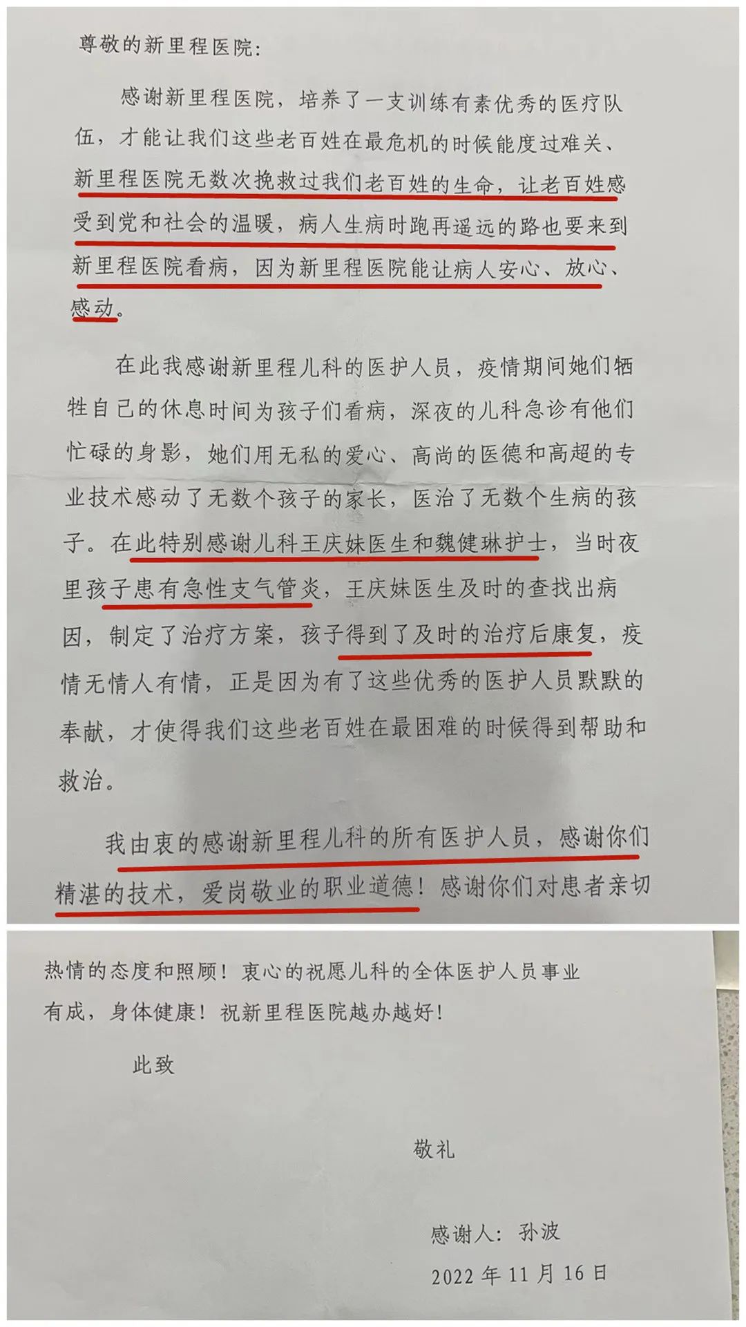 “當時半夜,孩子咳嗽厲害,又發燒,感謝兒科(kē)發熱(rè)門(mén)診的醫生(shēng)王慶妹(mèi)和護士魏健琳,耐心又熱(rè)情!”一位家長,在封控期間,因孩子患病而得(de)到醫院及時救治,事(shì)後,專程趕到兖礦新裡(lǐ)程總醫院送上一封感謝信,“兖礦新裡(lǐ)程總醫院讓病人安心、放(fàng)心、感動!”